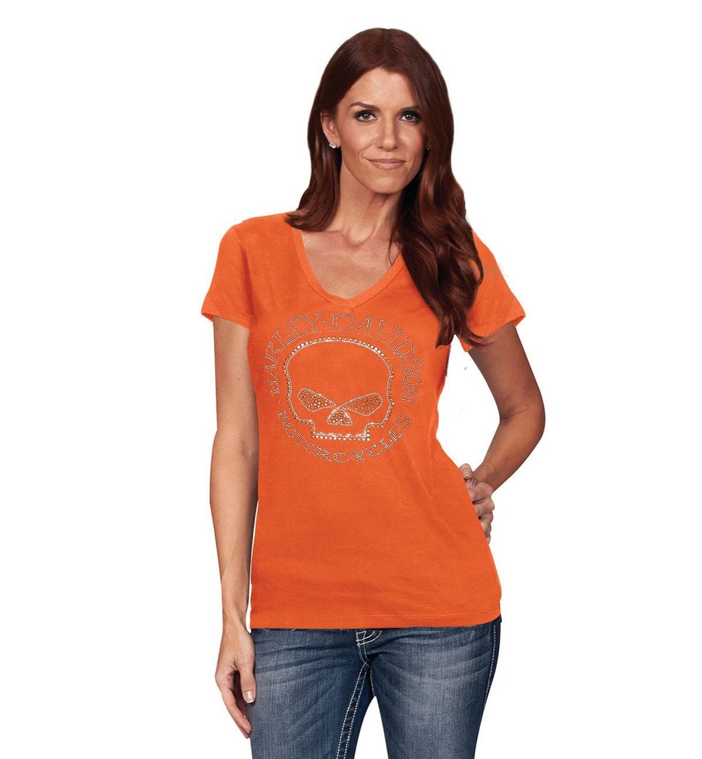 Harley-Davidson® Womens Genuine Motorcycles Bling Willie G Skull V-Neck Orange Short Sleeve T-Shirt